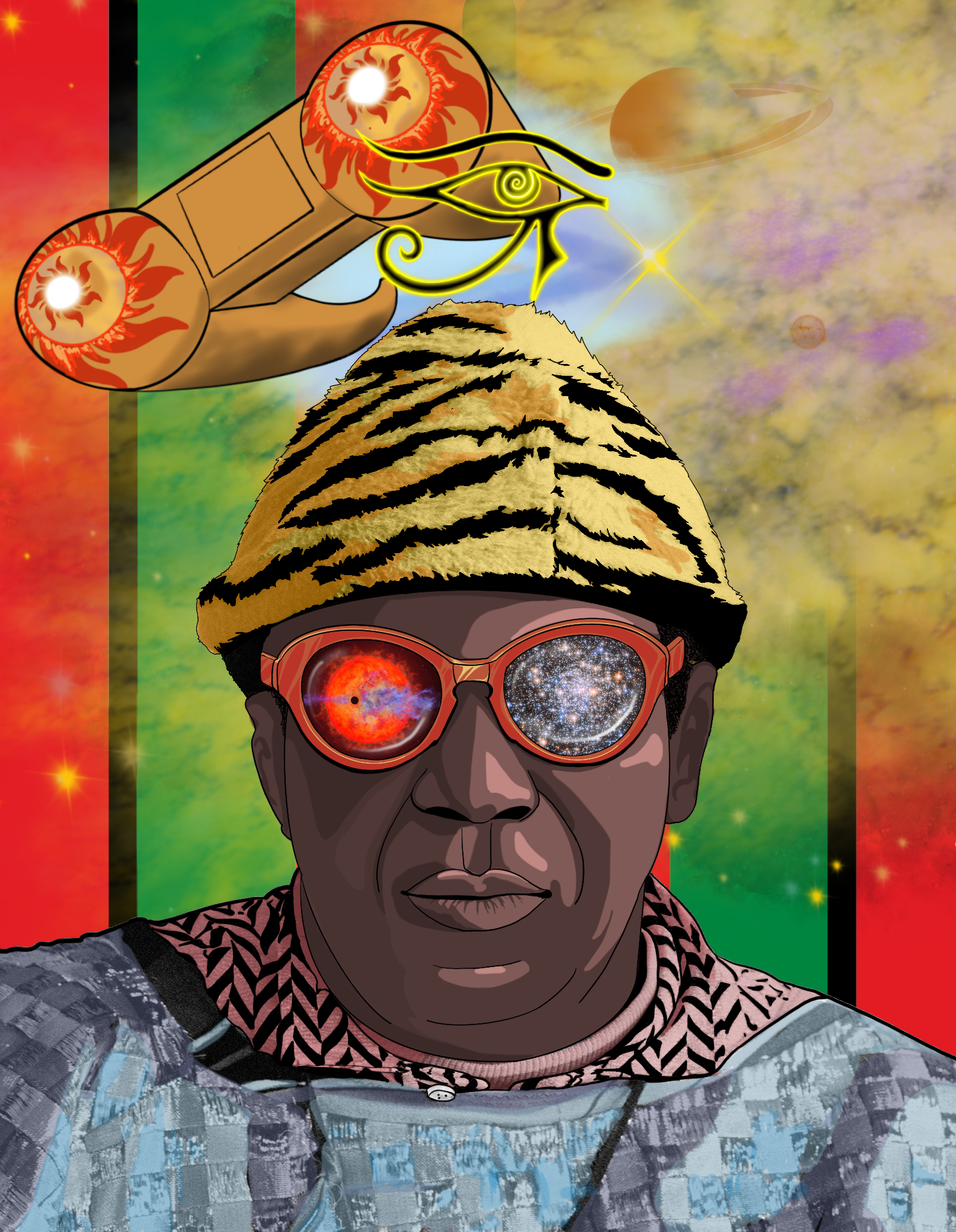 Made of whistle tones, hisses, and cacophonous keyboard noise, “Solar Ship Voyage” was the engine of the Arkestra doing the calculations for takeoff. More cacophony followed. Nonsensical rhythmic bangings and disturbed key smashes pervaded fifth and sixth tracks “Cosmo-Darkness” and “The Light Thereof.” The visuals came on as I shifted into autopilot. I saw the cosmos, sure. Bleeping lights and retro-futuristic technologies colored my mind. “Friendly Galaxy No. 2” was curious but warm. Its unsettled terrains breathed of life and mystery, with airy drums and twittering flutes creating a mysterious if lightly threatening lushness until it relaxes into calmness. It rolls into “To Nature’s God,” where I finally got to relax into the rhythmic chanting of the new world. “Okay,” I remember saying. “Now you got me.” By ‘“Space Loneliness No. 2,” I realized the purposeful discord, the otherworldliness, the aliens speaking in electronic key tones, space madness, the cold darkness of the vacuum, the wholeness and splendor of the Gods.